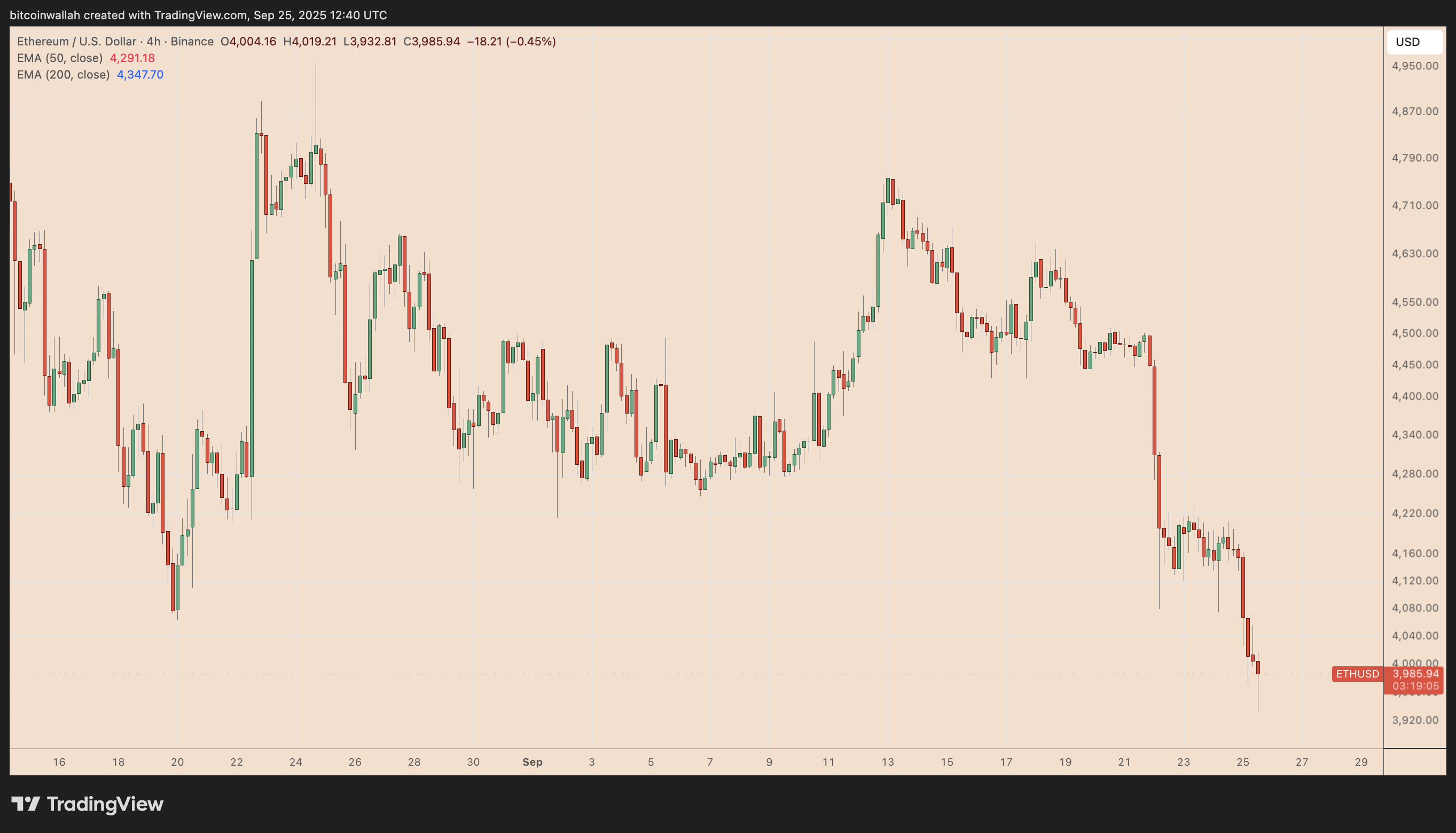 Đường này còn chồng chéo với đường trung bình động hàm mũ 200 ngày của ETH (EMA 200 ngày; sóng xanh) gần mức 3.392 USD, cho thấy giá có thể giảm 15% trong trường hợp xấu nhất nếu đà bán tháo kéo dài đến tháng 10.