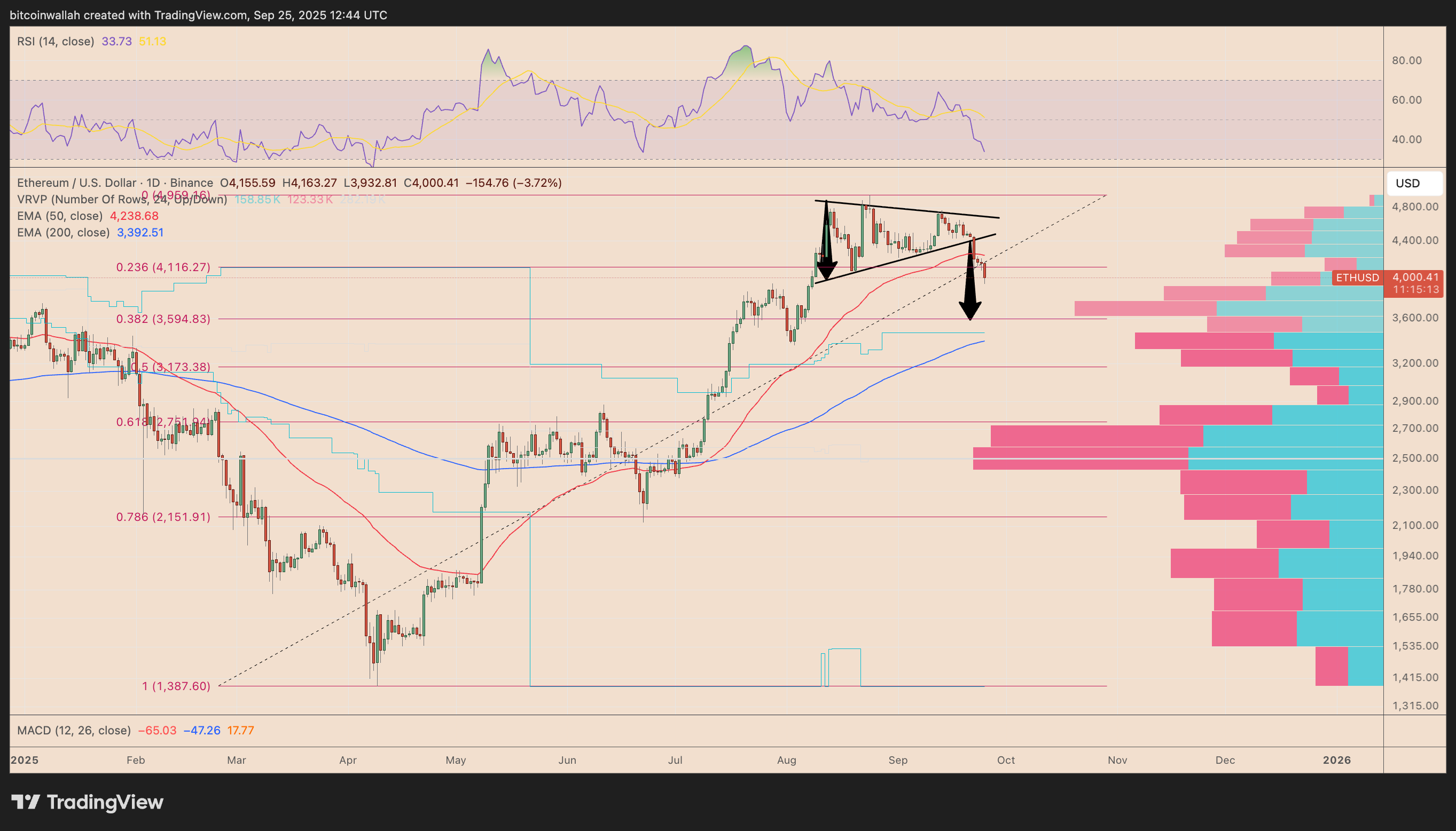 Mục tiêu giảm nằm trong vùng hỗ trợ—khu vực $3.600–$3.400—được nêu bật bởi Hồ sơ khối lượng của ETH (VPVR).