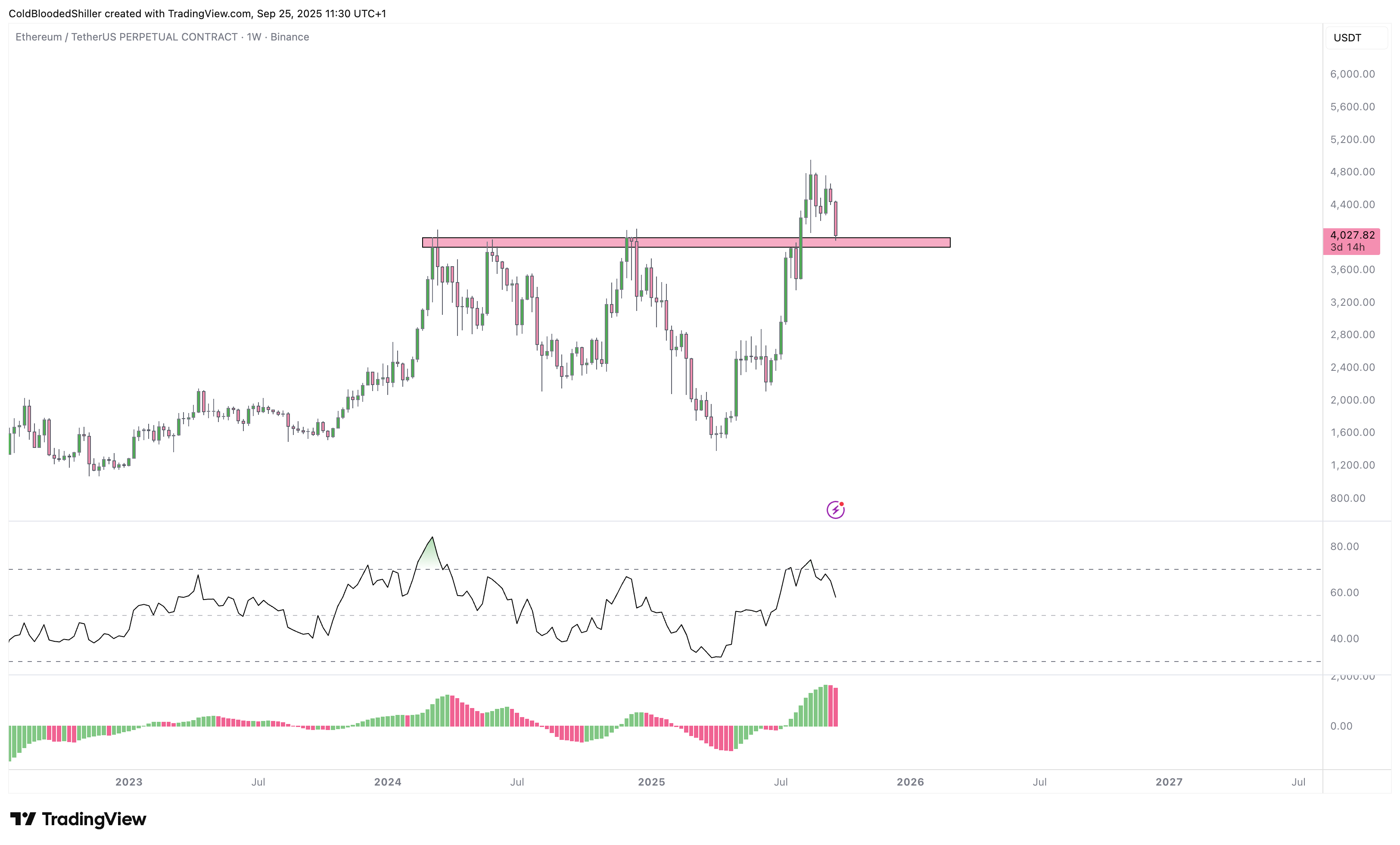 Trong khi đó, biểu đồ hàng tuần của Ethereum cho thấy giá đang kiểm tra lại vùng hỗ trợ ngang quan trọng quanh mức 3.800–4.000 USD, như nhà phân tích Cold Blood Shiller đã nhấn mạnh.