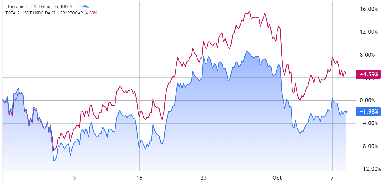 Tâm lý nhà đầu tư trái chiều, vì Ether đã giảm 2% kể từ ngày 1 tháng 9, trong khi vốn hóa thị trường altcoin đã tăng 4,5% trong cùng kỳ. Sự khác biệt này một phần có thể là do sự ra mắt ảm đạm của các quỹ Ether ETF tại Hoa Kỳ. Các ETF này không có dòng tiền ròng nào chảy vào vào ngày 7 tháng 10 và đã trải qua dòng tiền chảy ra tích lũy là 548 triệu USD kể từ khi ra mắt vào tháng 7, theo dữ liệu từ Farside Investors.