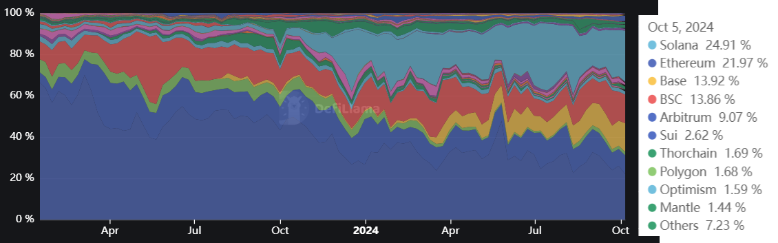 Những người đầu cơ Ether có thể cho rằng Ethereum vẫn giữ được vị trí dẫn đầu khi tính đến các giải pháp mở rộng layer-2 như Base, Arbitrum, Polygon và Optimism. Đáng chú ý, Base đã có những bước tiến đáng kể, chiếm 14% thị phần—một mức tăng ấn tượng từ mức dưới 1% chỉ bảy tháng trước.