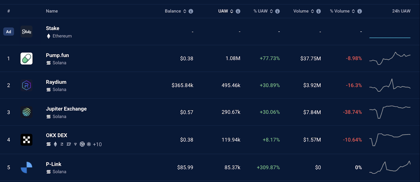 Số lượng địa chỉ mạng Solana tương tác với các ứng dụng phi tập trung đã tăng 38,5% trong 24 giờ qua lên 2,7 triệu. Hiệu suất tích cực được thấy trong năm DApp hàng đầu, với ví hoạt động độc đáo (UAW) của họ tăng 77%-300% như thể hiện trong biểu đồ bên dưới.