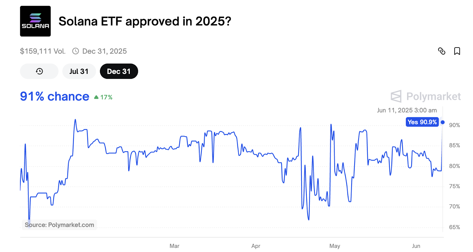 Theo dữ liệu của Polymarket, khả năng Ủy ban Chứng khoán và Giao dịch Hoa Kỳ (SEC) chấp thuận quỹ ETF Solana spot vào năm 2025 đã tăng lên 91% vào thứ Tư.
