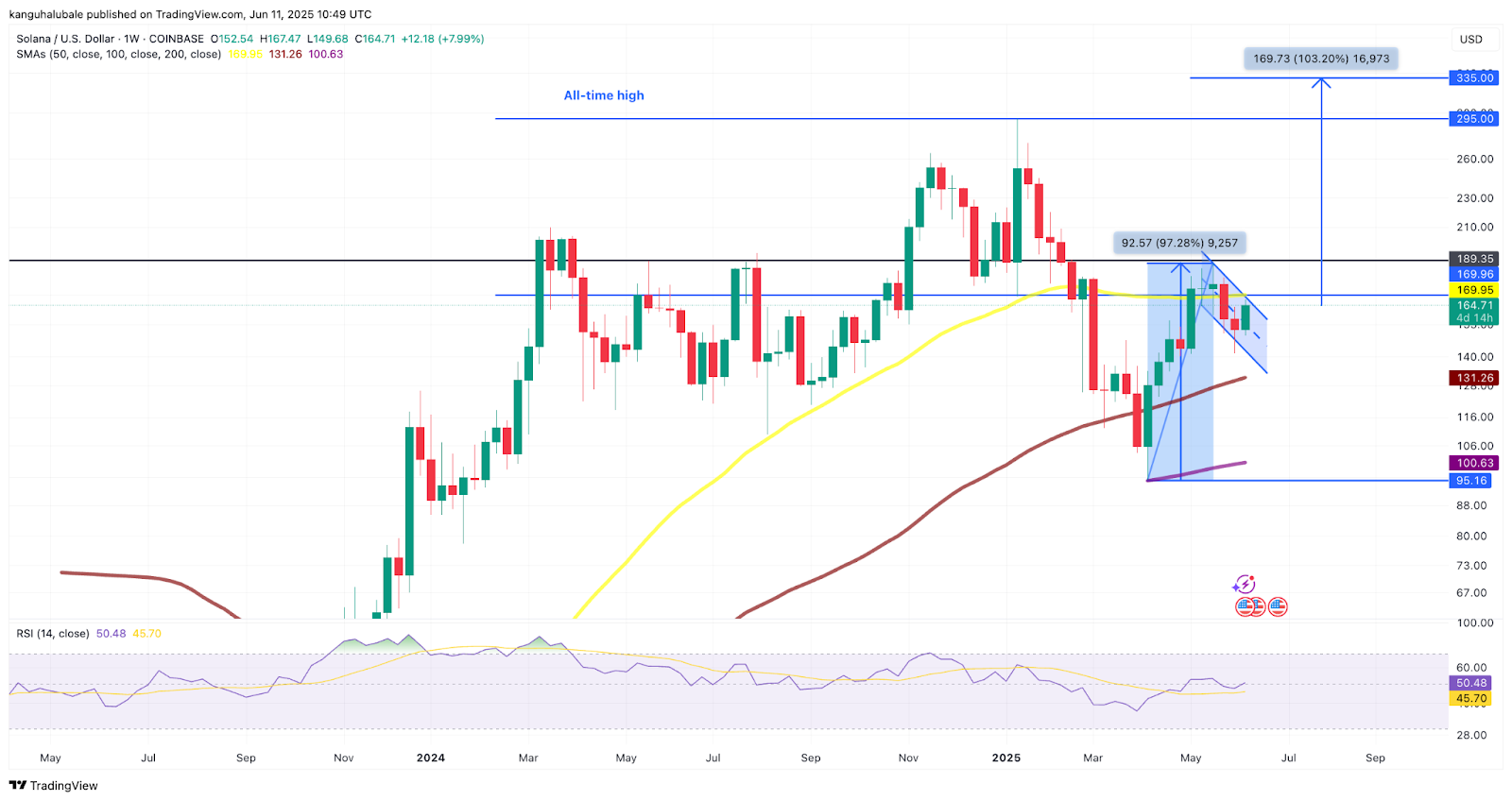 Giá SOL đã hình thành mô hình cờ tăng giá trên biểu đồ hàng tuần như minh họa bên dưới.