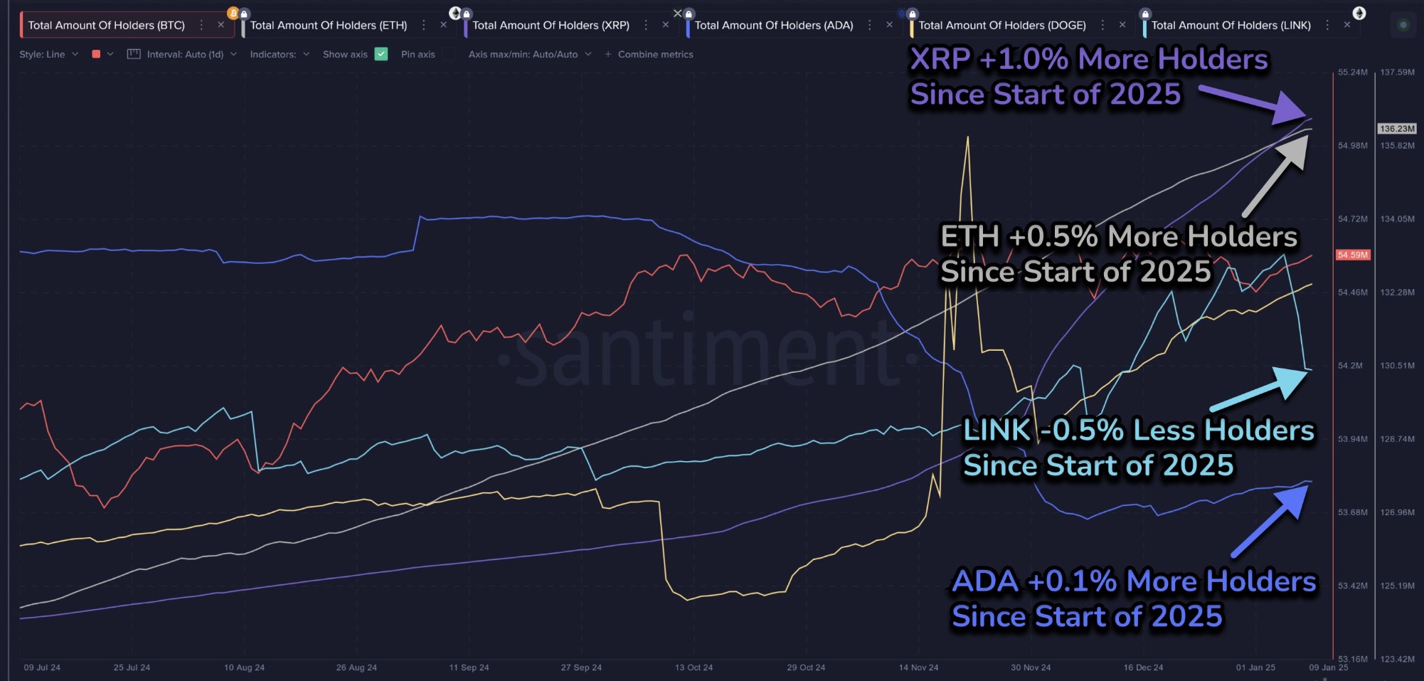 Biểu đồ do công ty nghiên cứu thị trường Santiment chia sẻ cho thấy Tổng số người nắm giữ XRP đã tăng 58.000 kể từ đầu năm 2025.