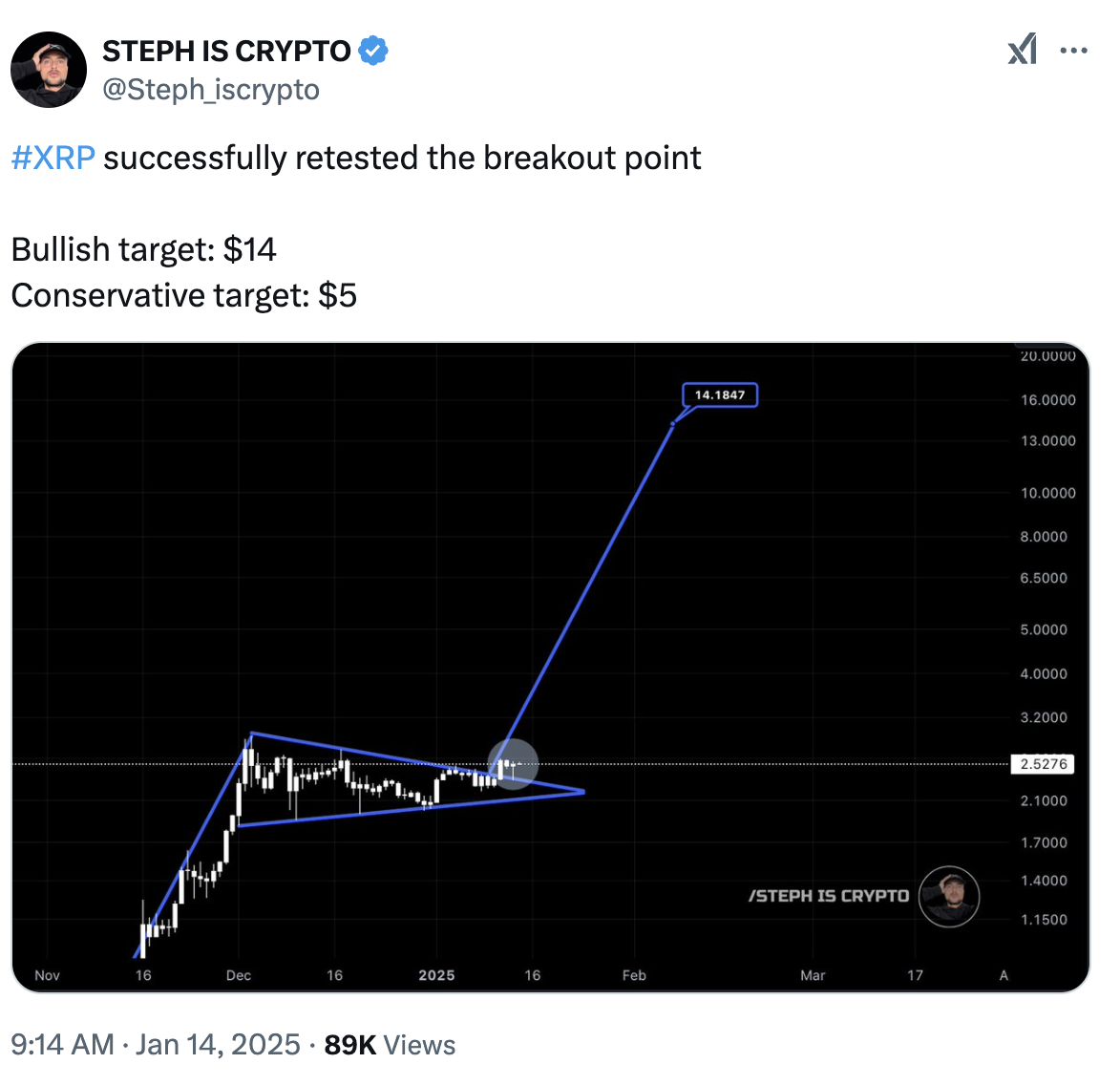 Đối với Stephh Is Crypto, cờ hiệu tăng giá là một phần của lá cờ tăng giá khổng lồ đã hình thành kể từ ngày 5 tháng 11 năm 2024. Phân tích của ông đặt mục tiêu đột phá về mặt kỹ thuật của lá cờ tăng giá lên trên 14 USD, tăng tới 390% so với mức hiện tại.