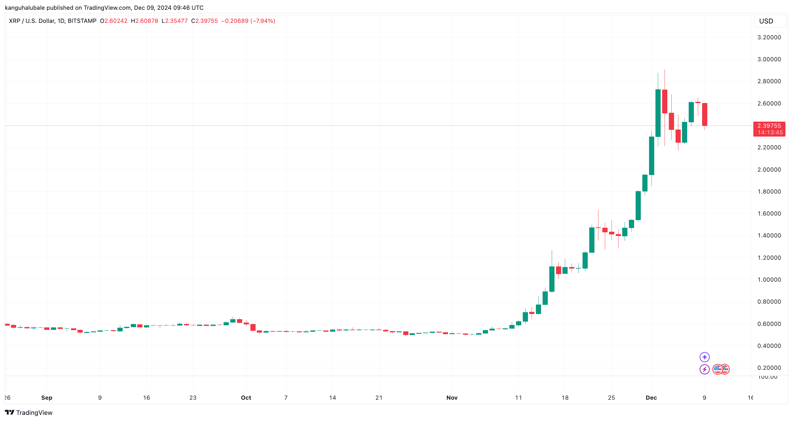 Giá XRP đã giảm đáng kể trong bảy ngày qua, xuống mức thấp nhất là 2,16 USD vào ngày 5 tháng 12. Giá XRP đã giảm tới 16% từ mức cao nhất trong nhiều năm là khoảng 2,90 USD xuống mức hiện tại là 2,39 USD.