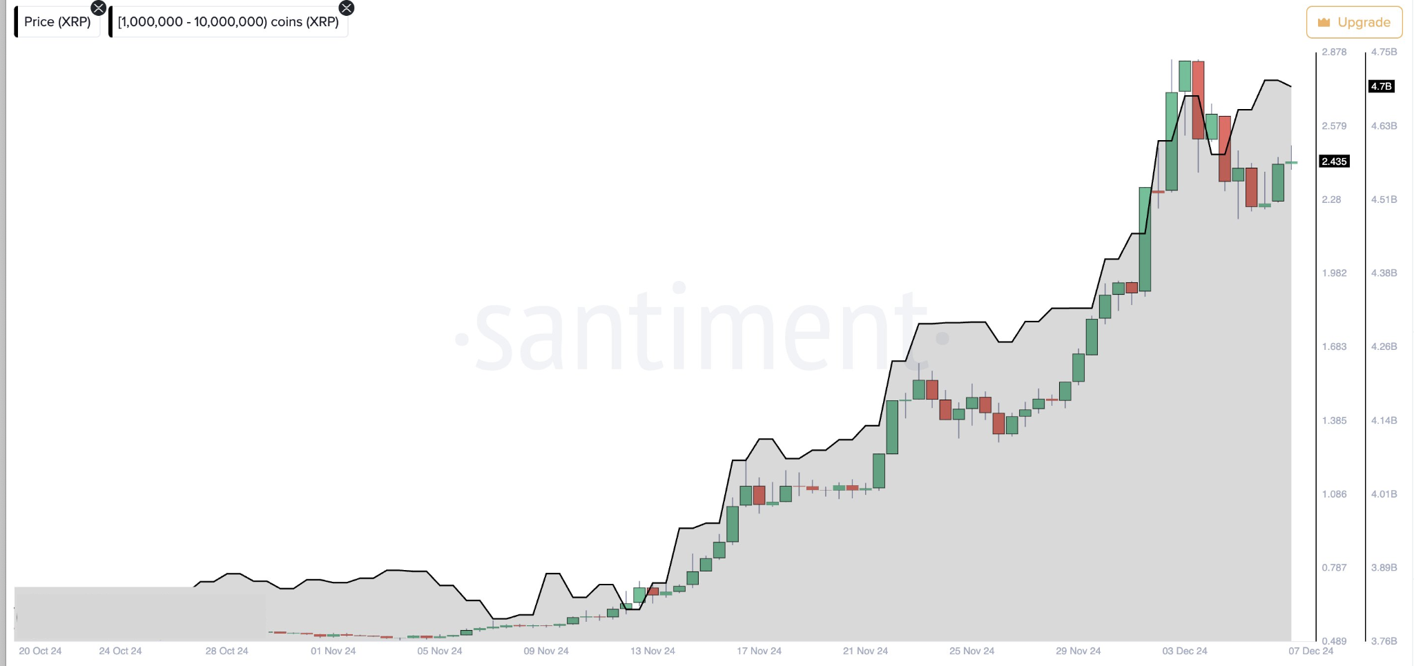 Dữ liệu từ Santiment cho thấy số lượng token do các địa chỉ cá voi nắm giữ từ 1 triệu đến 10 triệu XRP đã tăng mạnh từ ngày 3 tháng 12 đến ngày 8 tháng 12.
