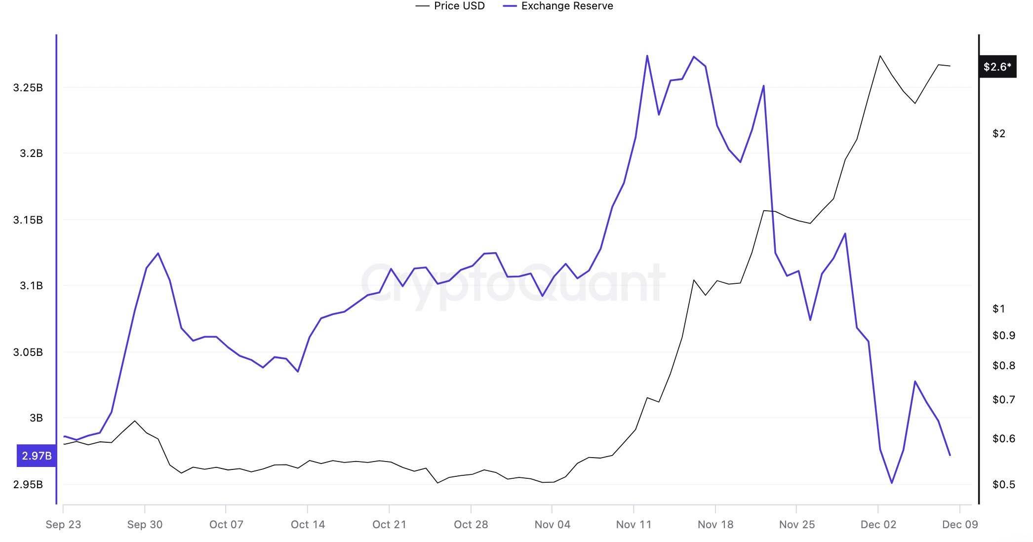 Cụ thể, có sự sụt giảm đáng kể về nguồn cung XRP trên các sàn giao dịch, như được chứng minh bằng dữ liệu từ CryptoQuant. Biểu đồ bên dưới cho thấy số dư XRP trên các sàn giao dịch đã giảm 10% từ ngày 5 tháng 12, khi giá giảm xuống còn 2,16 USD, đến ngày 8 tháng 12.
