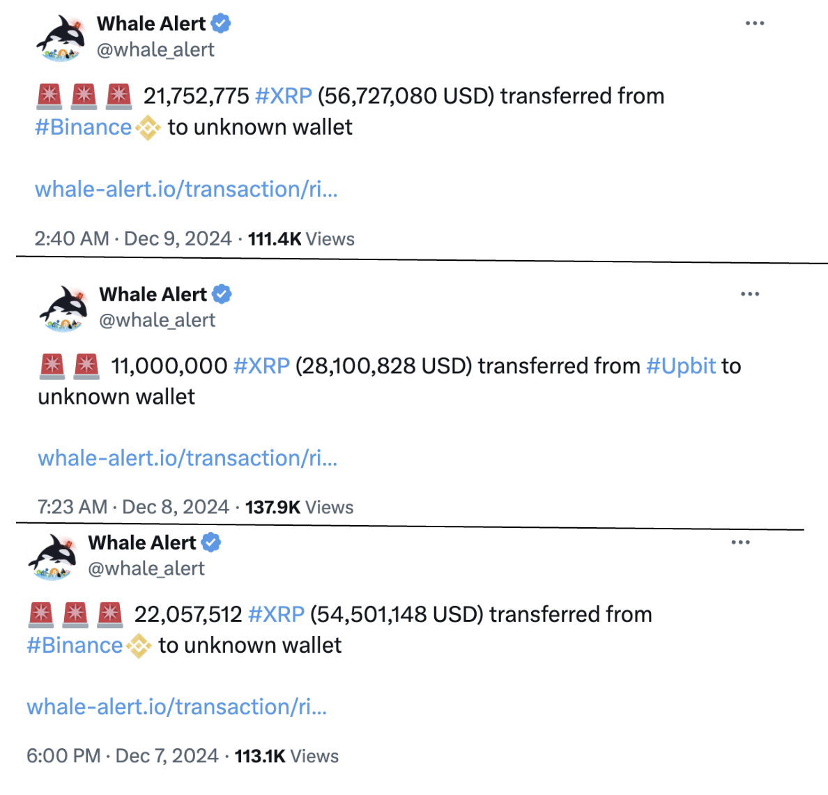 Bao gồm cả việc một cá voi chuyển 21,7 triệu token XRP trị giá 56,7 triệu USD từ sàn giao dịch tiền điện tử Binance vào một ví không xác định. Việc chuyển tiền này có thể là một phần trong ý định của nhà đầu tư nhằm giữ token của họ trong ví tự lưu ký để dự đoán giá sẽ tiếp tục tăng.