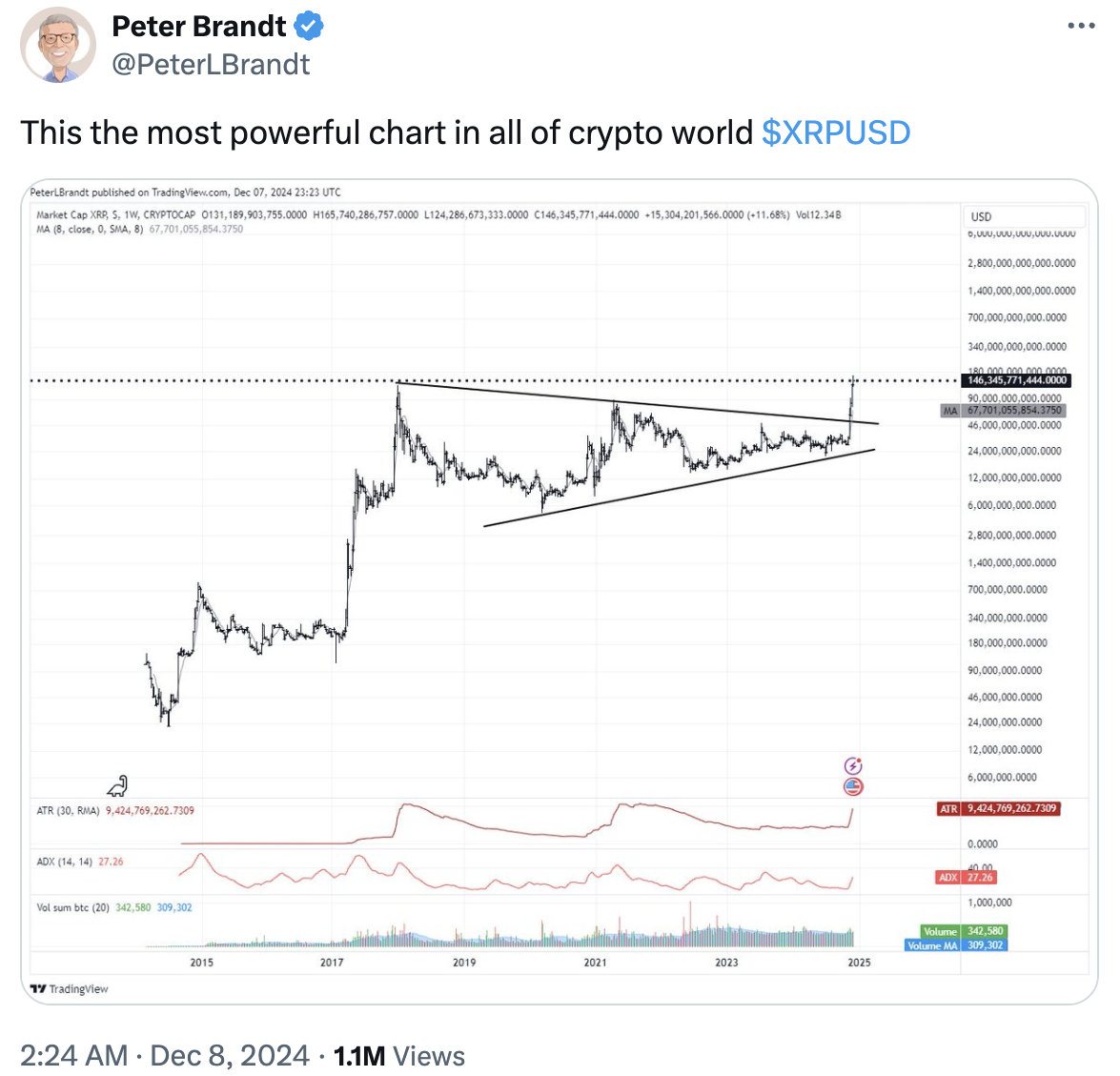 Mức tăng của XRP lên 2,90 USD vào ngày 3 tháng 12 thấp hơn 38% so với mức cao nhất mọi thời đại là 3,84 USD được ghi nhận vào ngày 4 tháng 1 năm 2018. Phân tích của Brandt đã dẫn đến những cuộc thảo luận về khả năng duy trì đà tăng giá lên mức cao mới mọi thời đại của token này.