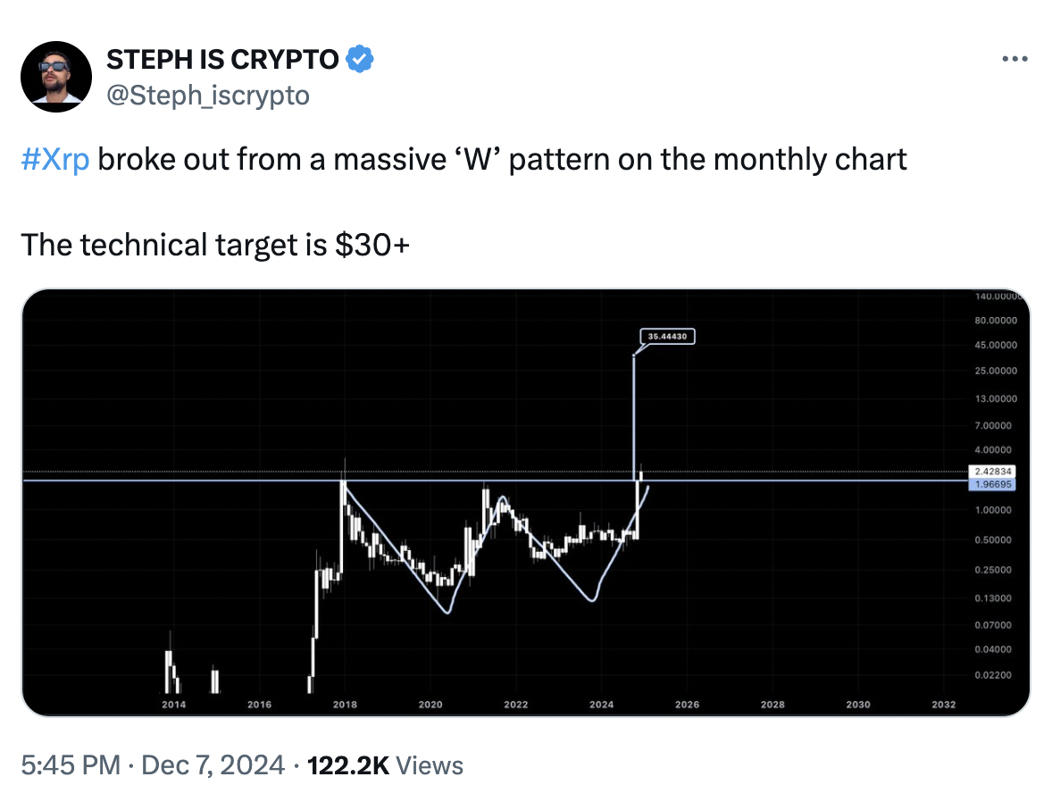 Trong khi đó, nhà phân tích Steph Is Crypto đã chia sẻ một bài viết cho thấy XRP đã thoát khỏi mô hình tăng giá “W” với mục tiêu được đặt ở mức trên 35 USD.