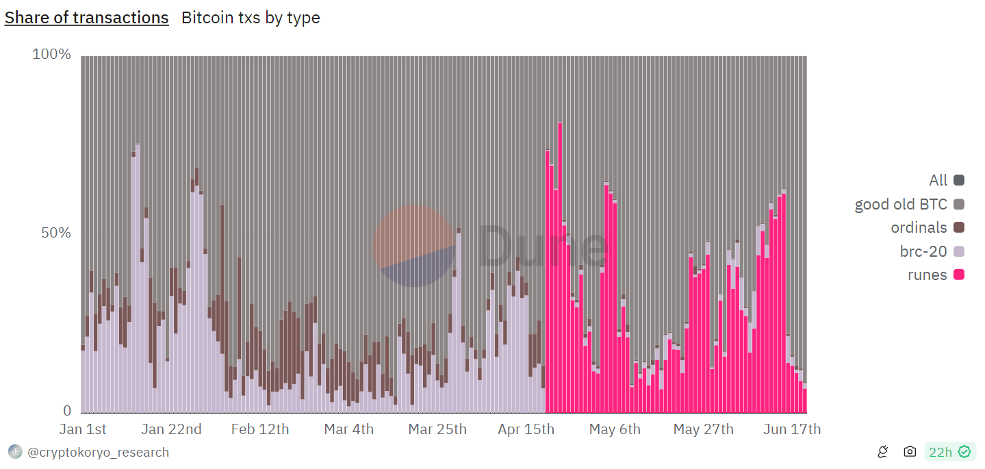 Biểu đồ của Dune Analytics, Cryptokoryo mô tả thời điểm xác định vào ngày 20 tháng 6, khi giao dịch BTC thống trị 91,4%, 6,8% đối với Runes, 1,6% đối với BRC-20 và 0,2% đối với Ordinals trong tỷ lệ giao dịch.