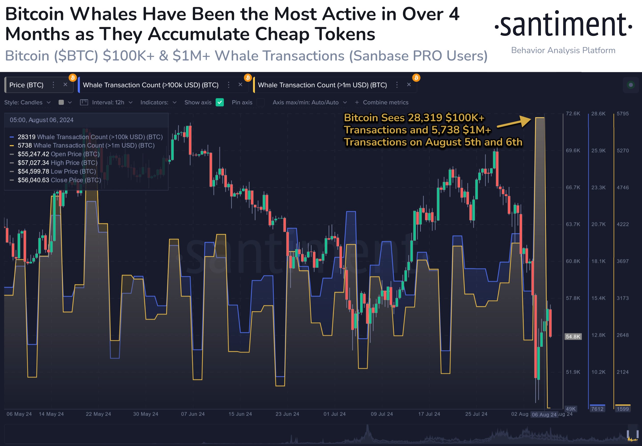 Theo dữ liệu trên chuỗi, các giao dịch Bitcoin của cá voi đạt mức cao nhất kể từ tháng 4 trong đợt bán tháo tiền điện tử quy mô lớn vào ngày 5 và 6 tháng 8.