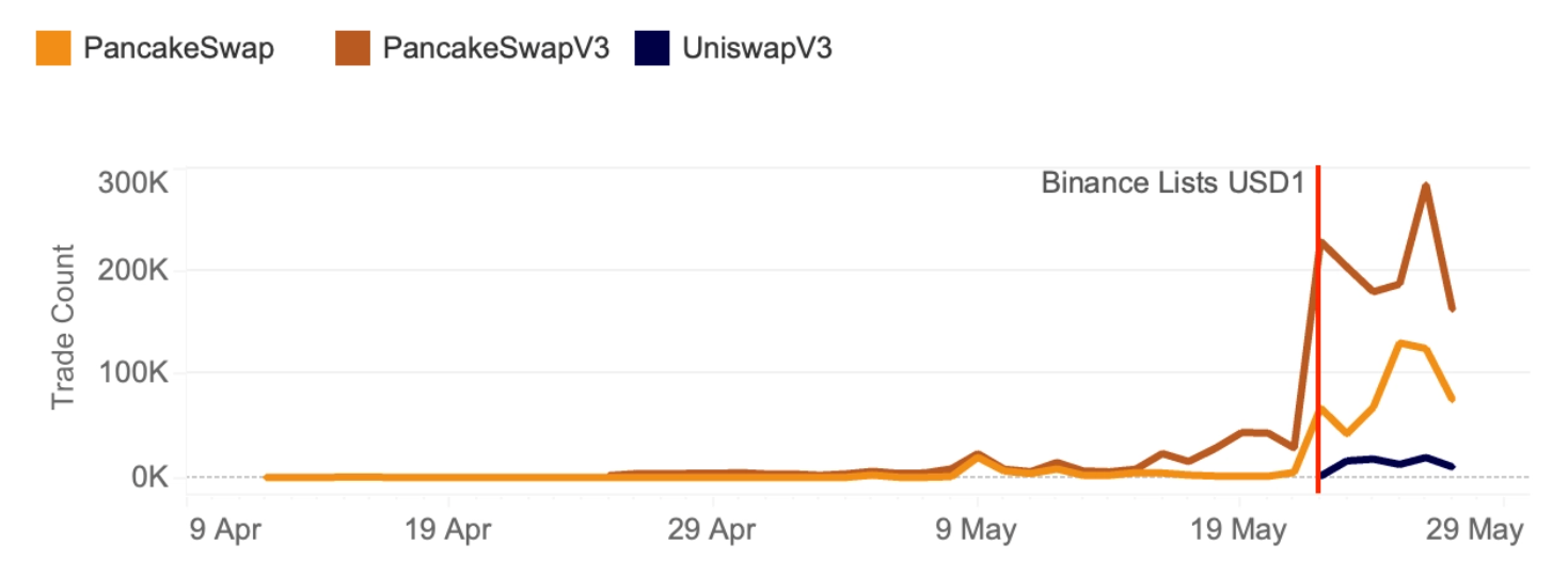 Tổng thống Trump đang tham gia vào một số dự án tiền điện tử, và stablecoin USD1 gần đây đã thu hút rất nhiều sự quan tâm. Việc niêm yết trên Binance vào cuối tháng 05 ngay lập tức tăng khối lượng giao dịch, nhưng ý nghĩa đầy đủ không ngay lập tức được thể hiện.