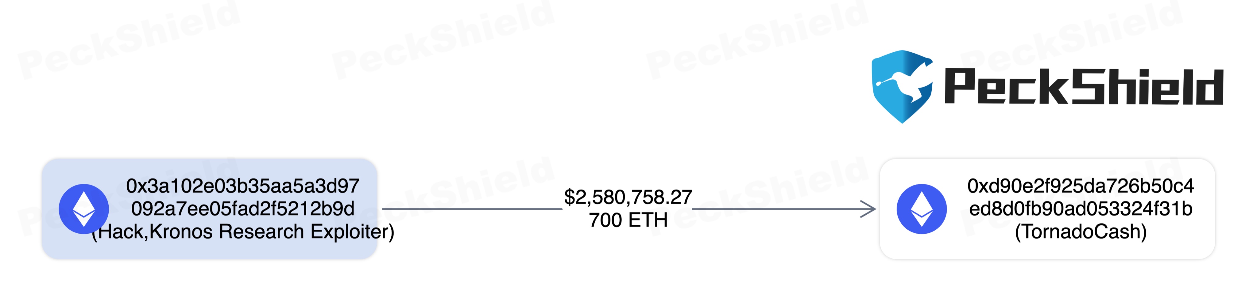 Theo một bài đăng trên X của công ty bảo mật trực tuyến PeckShield, việc chuyển tiền trị giá 700 Ether (ETH), xảy ra từ ví khai thác Kronos “0x3” vào ngày 21 tháng 5.