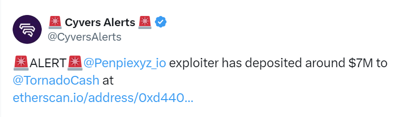 Vào ngày 4 tháng 9, công ty bảo mật Web3 Cyvers đã cảnh báo về việc hacker chuyển 26% số tiền bị hack vào địa chỉ Tornado Cash.