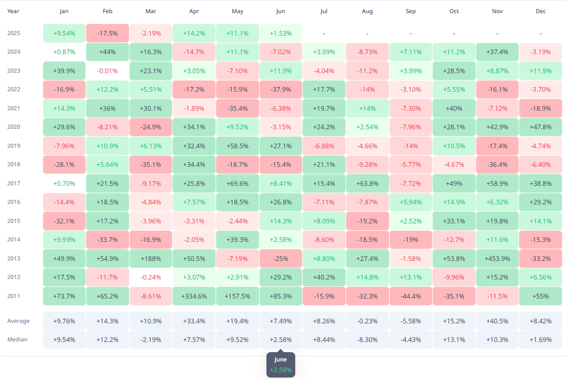 Dữ liệu lợi nhuận hàng tháng lịch sử cho thấy Bitcoin thường có tháng 06 tích cực, với mức tăng trung bình 2.58%. Điều này cho thấy dù Bitcoin có thể đối mặt với điều chỉnh ngắn hạn do bán ra, xu hướng thị trường rộng hơn có thể hỗ trợ sự phục hồi giá.