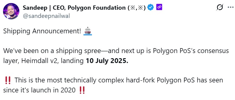 Trong một bài đăng trên X, Giám đốc điều hành Polygon Foundation – ông Sandeep Nailwal –  cho biết bản nâng cấp này sẽ tăng cường “xương sống” cho mạng lưới PoS của Polygon, thay thế các thành phần cũ từ năm 2018 và 2019 bằng hạ tầng hiện đại hơn.