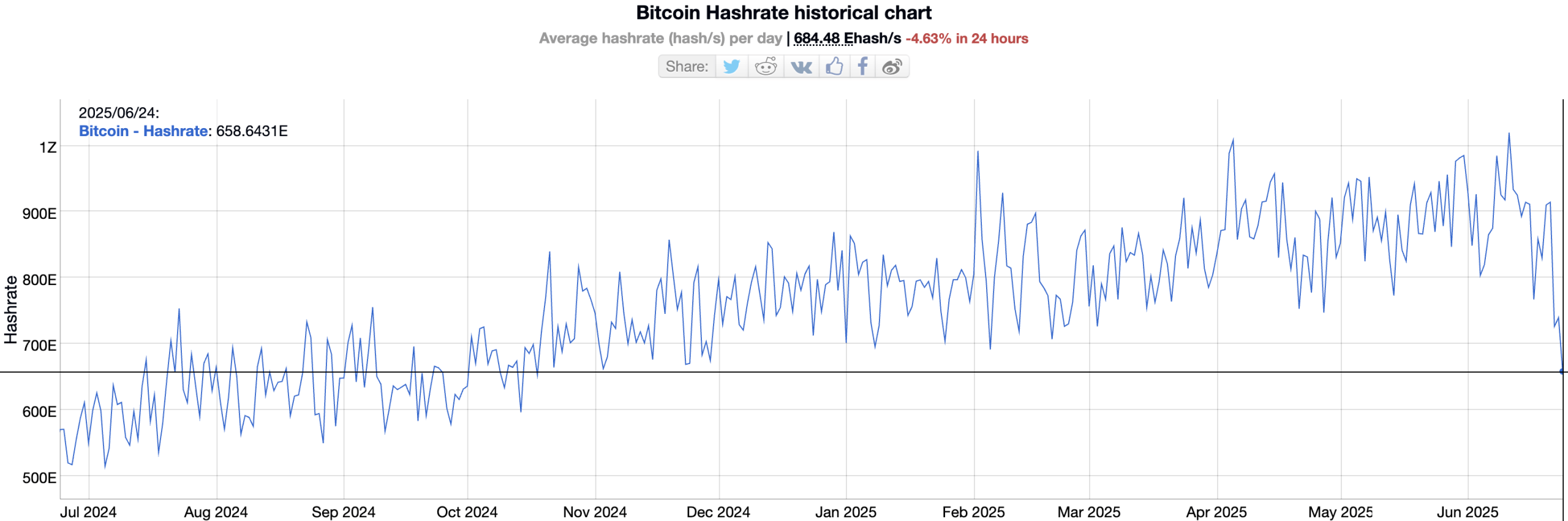 Theo dữ liệu từ BitInfoCharts, hashrate trung bình hàng ngày của Bitcoin đã giảm xuống còn 684.48 EH/s, mức thấp nhất kể từ giữa tháng 10 năm ngoái.