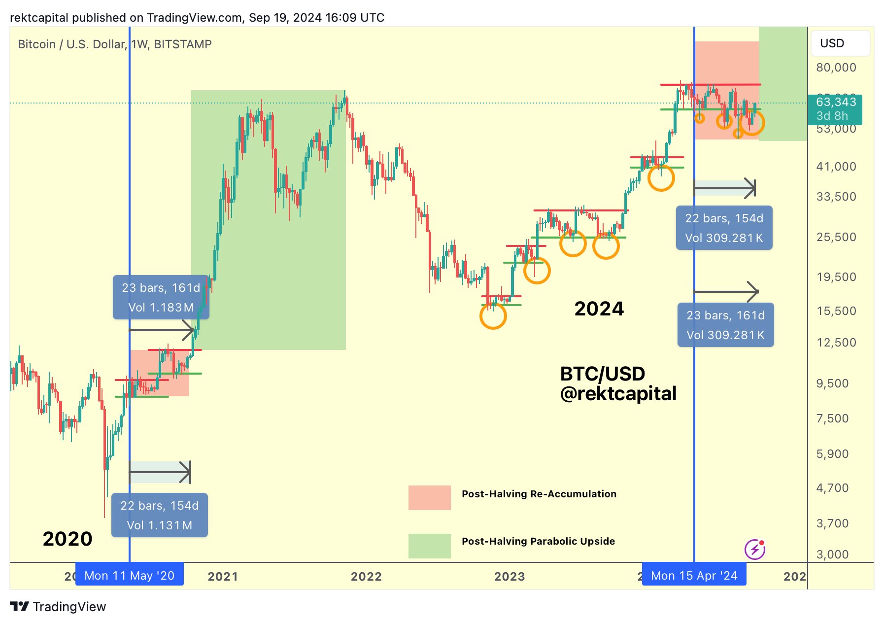 Trong khi đó, thời gian cho breakout đó đang dần cạn kiệt — BTC/USD đã nằm trong phạm vi mà Rekt Capital gọi là “phạm vi tích lũy lại” kể từ sự kiện halving vào tháng 4.