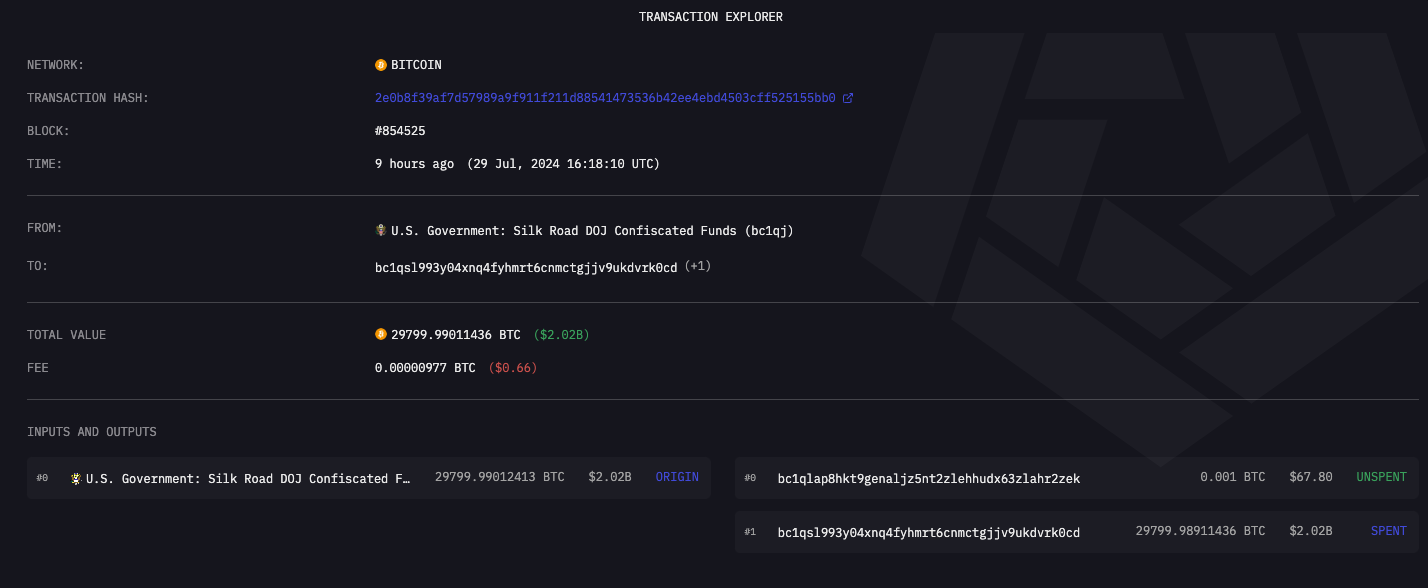 Theo dữ liệu từ nền tảng phân tích blockchain Arkham Intelligence, ví của chính phủ – nơi lưu trữ Bitcoin bị tịch thu từ Silk Road – đã chuyển 29.800 Bitcoin (BTC) đến một địa chỉ ví không xác định vào ngày 29 tháng 7.