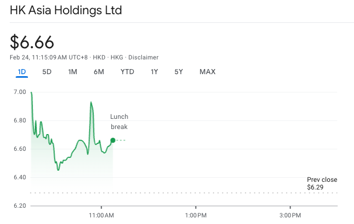 Cổ phiếu HK Asia bắt đầu giao dịch vào ngày 24 tháng 2 ở mức khoảng 7 đô la Hồng Kông (90 xu), tăng hơn 11% so với mức đóng cửa vào thứ sáu ngày 21 tháng 2. Nguồn: Google Finance.