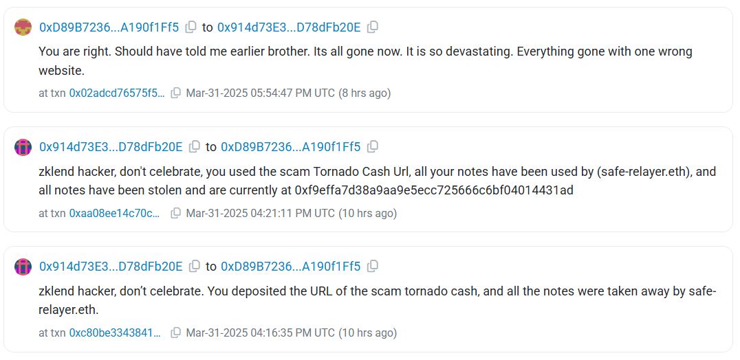 Trong tin nhắn gửi tới zkLend thông qua Etherscan vào ngày 31 tháng 3, hạker tuyên bố đã mất 2.930 Ether (ETH) từ số tiền bị đánh cắp vào một trang web lừa đảo giả dạng giao diện của Tornado Cash.