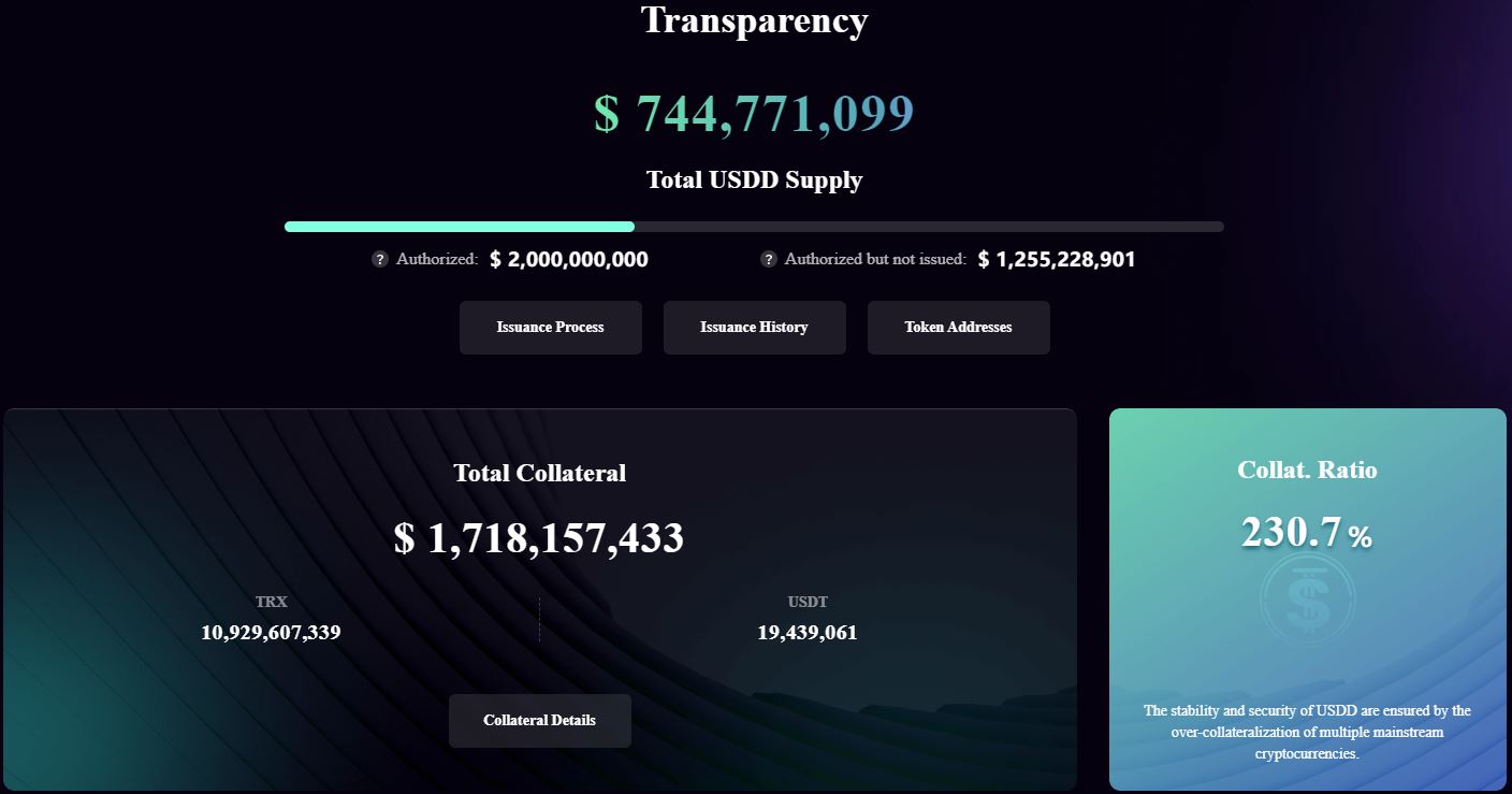 Trang minh bạch của USDD hiện cho thấy hơn 744 triệu USDD đang lưu hành. Trang minh bạch của stablecoin này liệt kê 1,7 tỷ USD TRX và USDT trong dự trữ của nó, mang lại tỷ lệ thế chấp hơn 230%.
