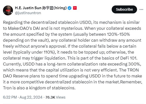 Trong tuyên bố ngày 22 tháng 8 về X, Sun đã hạ thấp mối lo ngại, lập luận rằng cơ chế của USDD tương tự như DAI của MakerDAO và cho phép người nắm giữ tài sản thế chấp rút tiền mà không cần chấp thuận nếu tài sản thế chấp vượt quá số tiền do hệ thống chỉ định.