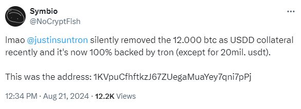 Công cụ khám phá blockchain Blockchair cho thấy 12.000 Bitcoin, trị giá hơn 729 triệu USD, đã bị xóa khỏi một địa chỉ vào ngày 19 tháng 8, trước đó được liệt kê là nắm giữ một số tài sản thế chấp cho Decentralized USD (USDD).