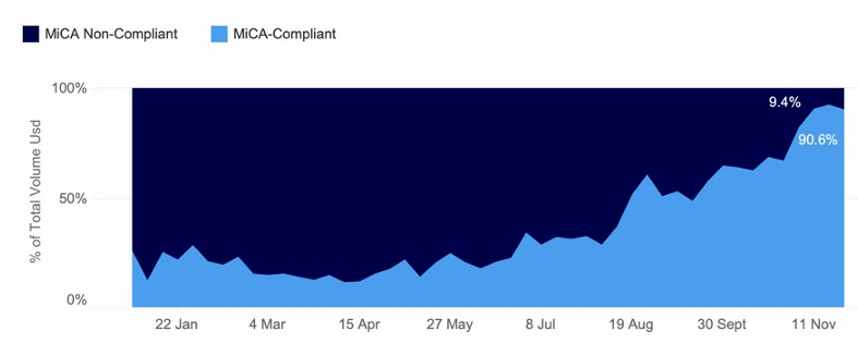 Tính đến cuối năm 2024, các loại stablecoin tuân thủ MiCA đã chiếm lĩnh phần lớn thị trường châu Âu. EURC của Circle, EURCV của Societe Generale và EURI của Banking Circle cùng nhau nắm giữ 91% thị phần vào tháng 11.