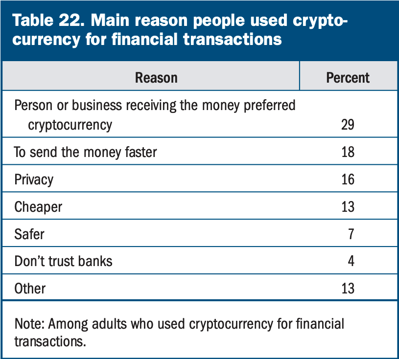 Đối với 1% đã sử dụng tiền điện tử cho giao dịch tài chính, gần 30% cho biết đó là do người nhận hoặc công ty ưa thích tiền điện tử hơn. Lý do ít được nêu ra nhất là sự thiếu tin tưởng vào ngân hàng.