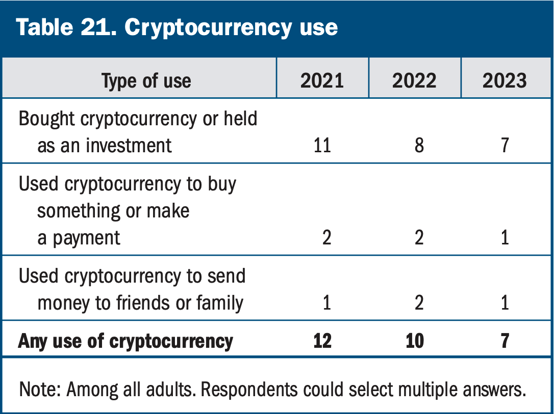 Chỉ 1% người trưởng thành cho biết họ sử dụng tiền điện tử làm phương thức thanh toán hoặc gửi tiền, giảm một nửa so với năm 2022, trong khi 7% mua hoặc nắm giữ tiền điện tử như một khoản đầu tư.