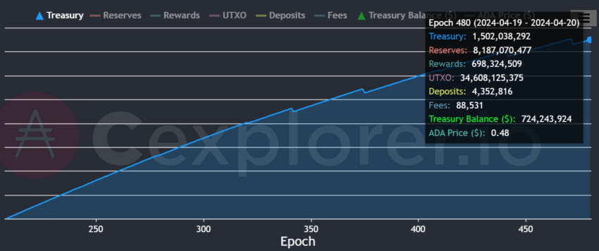 Kho bạc của Cardano đã tích trữ 1,5 tỷ token ADA, trị giá hơn 720 triệu USD, chiếm hơn 4% nguồn cung lưu hành.