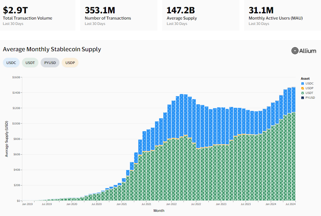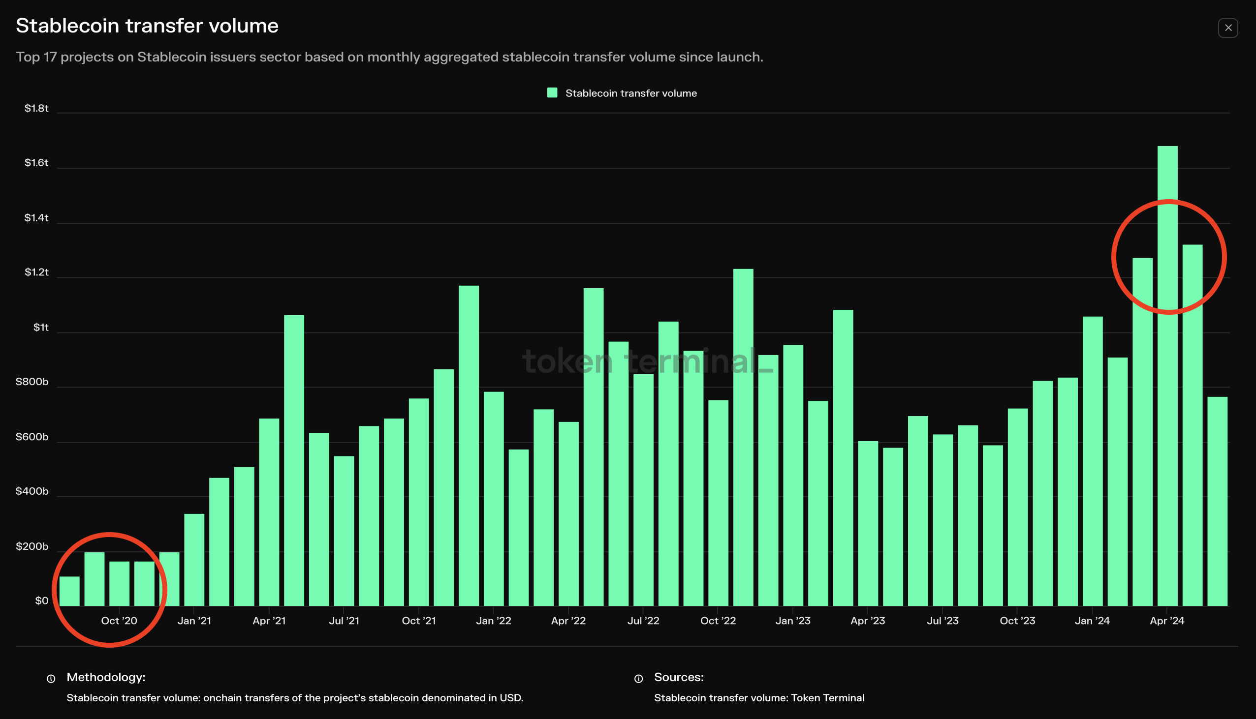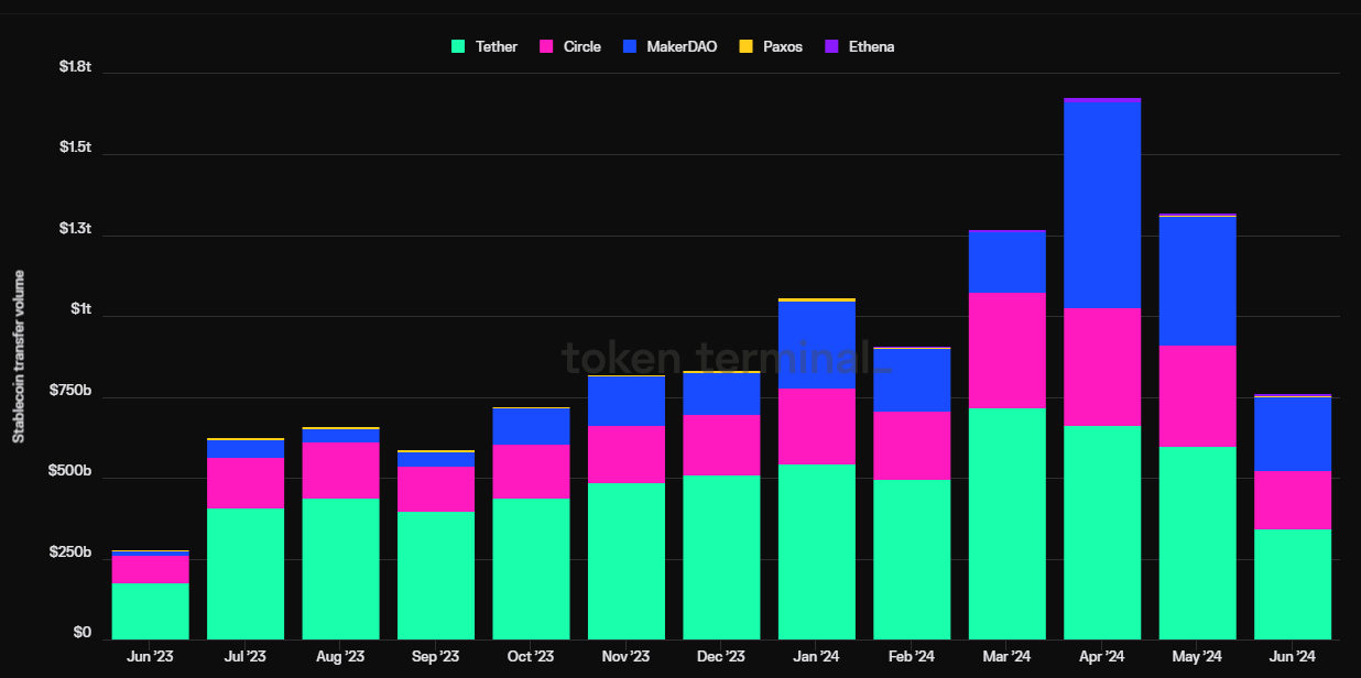 Theo dữ liệu của Token Terminal, khối lượng chuyển giao stablecoin tích lũy lần đầu tiên vượt mốc 1 nghìn tỷ USD vào tháng 3 năm 2024, đạt tổng cộng 1,27 nghìn tỷ USD trên tất cả các tổ chức phát hành stablecoin, theo dữ liệu của Token Terminal.