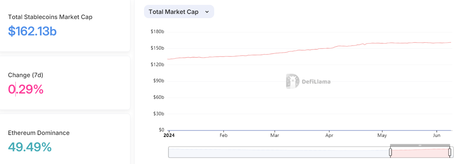 Vốn hóa thị trường tích lũy của tất cả các stablecoin nằm ở mức hơn 162 tỷ USD, tăng từ mức 130 tỷ USD vào ngày 1 tháng 1, theo DeFiLlama.