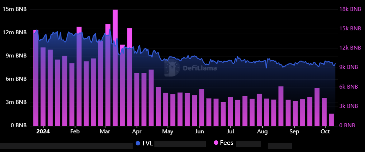 Hiện tại, tổng giá trị bị khóa (TVL) của BNB Chain là 8,1 triệu BNB, cho thấy ít thay đổi so với hai tháng trước. Tuy nhiên, phí mạng đã giảm xuống mức thấp nhất trong hơn bốn năm trong tuần kết thúc vào ngày 7 tháng 10. Phí tích lũy là 1.880 BNB trong khoảng thời gian đó đánh dấu mức giảm đáng kể 56% so với tuần trước.