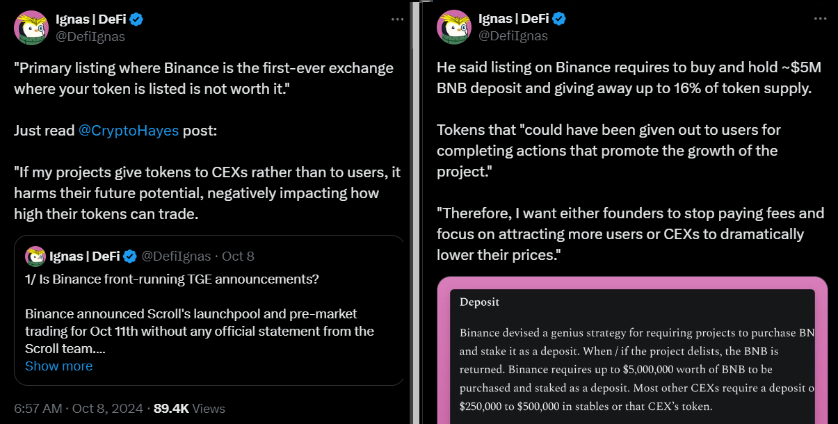 Ignas, đồng sáng lập của Pink Brains DeFi Creator Studio, cho rằng Ethereum layer-2 Scroll có thể đã tung ra token của mình thông qua một decentralized launchpool, chỉ phân bổ 5,5% nguồn cung cho các ưu đãi thanh khoản. Cách tiếp cận này có thể thúc đẩy hoạt động của hệ sinh thái và cuối cùng buộc các sàn giao dịch tập trung lớn (CEX) niêm yết token một cách tự nguyện. Ignas lập luận rằng việc niêm yết CEX trả phí hiếm khi tạo ra các ưu đãi cho việc nắm giữ lâu dài.
