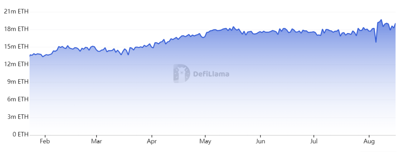 Theo dữ liệu của DefiLlama, tổng giá trị bị khóa (TVL) của Ethereum đã tăng 9% trong ba mươi ngày, đạt 18,6 triệu ETH vào ngày 18 tháng 8. Ngược lại, tiền gửi trên BNB Chain bằng BNB đã giảm 3% và TVL của Tron tính theo TRX đã giảm 7% trong cùng kỳ. Sự phân kỳ này phản ánh sự tự tin của các nhà đầu tư trung hạn vào giá Ethereum.