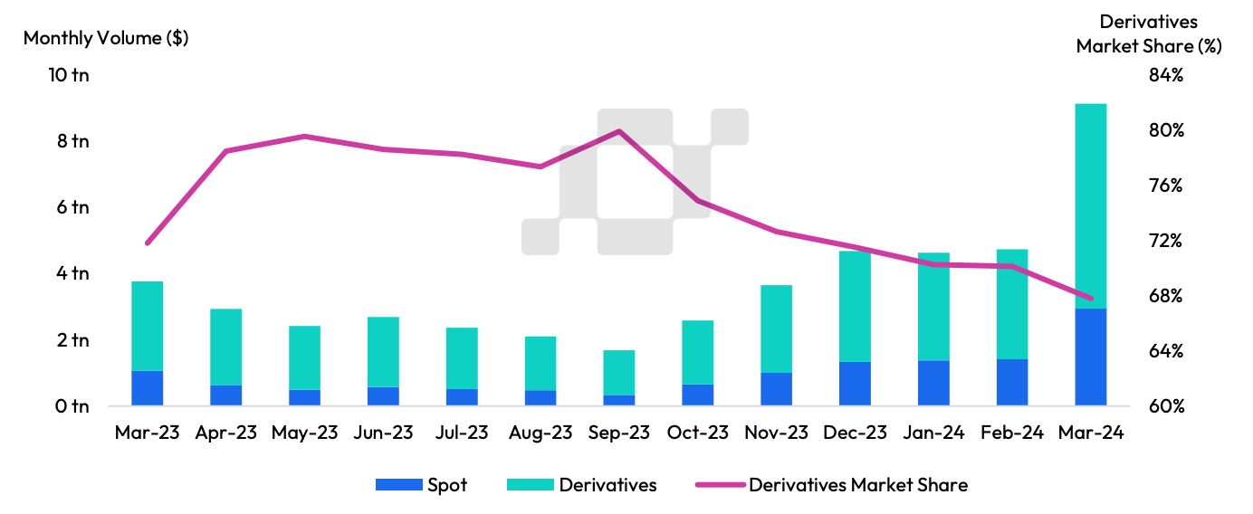 Sự gia tăng đột biến trong giao dịch giao ngay và hoạt động giao dịch phái sinh cũng trùng hợp với sự phấn khích ngày càng tăng xung quanh sự thành công của các quỹ Bitcoin ETF spot và sự kiện giảm một nửa nguồn cung BTC, dự kiến vào cuối tháng 4.