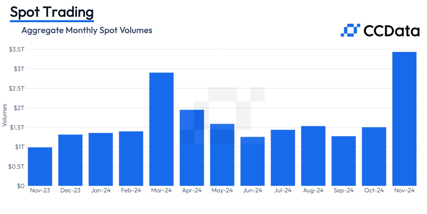 Theo báo cáo ngày 3 tháng 12 của CCData, một công ty nghiên cứu tiền điện tử, khối lượng giao dịch trên các sàn giao dịch tiền điện tử tập trung (CEX) đạt mức cao nhất mọi thời đại vào tháng 11, với khối lượng vượt quá 10 nghìn tỷ USD trên thị trường giao ngay và thị trường phái sinh.