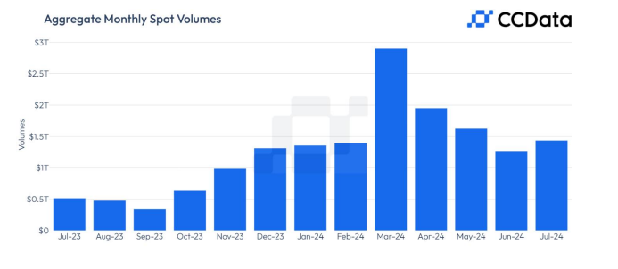 Trong một bước ngoặt đáng kể, khối lượng giao dịch tiền điện tử toàn cầu trên các sàn giao dịch tập trung đã tăng vọt 19% vào tháng 7, đạt 4,94 nghìn tỷ USD. Đây là mức tăng đầu tiên về khối lượng giao dịch trong bốn tháng.