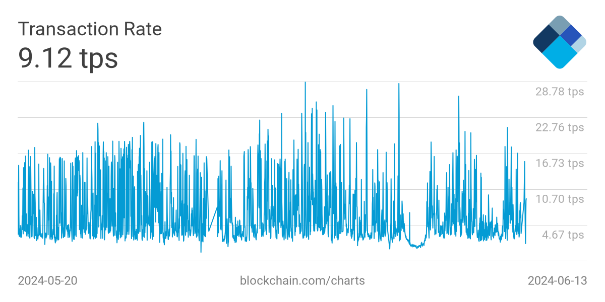 Đạt mức cao nhất khoảng 28 TPS và mức thấp dưới 4,5 TPS cho đến tháng 6, TPS trung bình tại thời điểm viết bài là 9,12 TPS.