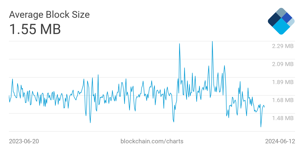 Kích thước khối giảm – thước đo dữ liệu giao dịch có trong mỗi khối – cho thấy hoạt động của blockchain Bitcoin (BTC) giảm mạnh, chạm mức thấp hàng năm vào ngày 7 tháng 6.