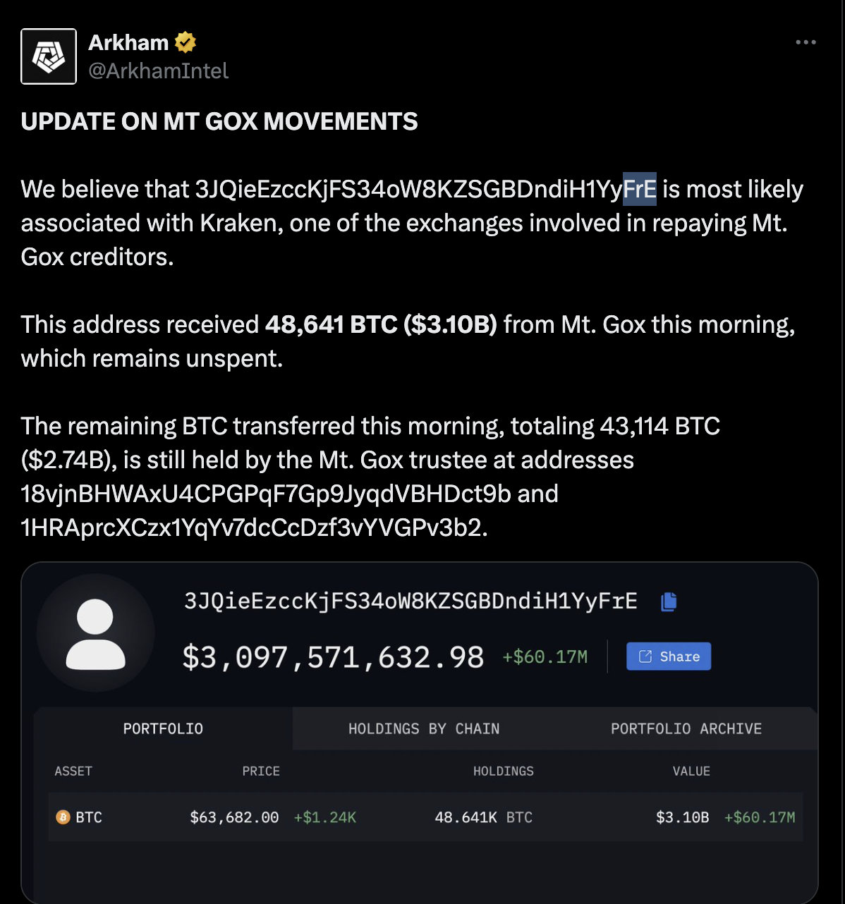 Arkham Intelligence cũng phát hiện một giao dịch chuyển 48.641 Bitcoin (BTC), trị giá 3,1 tỷ USD, từ ví ủy thác của Mt. Gox vào sáng ngày 16 tháng 7, mà nền tảng phân tích này tin rằng là ví có liên quan đến Kraken.