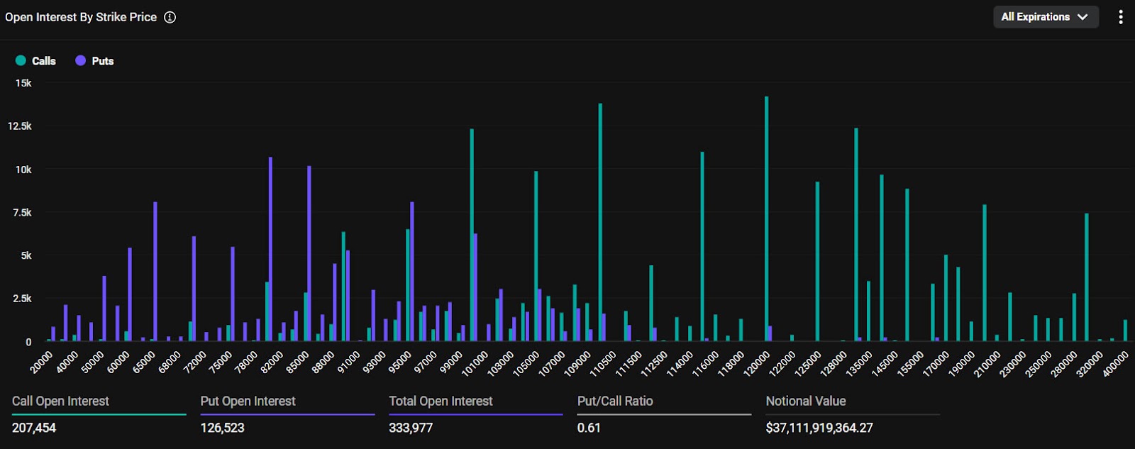 Thị trường quyền chọn Bitcoin cũng thể hiện xu hướng tương tự, với OI hơn 1,5 tỷ USD tại các mức giá thực hiện 110,000 USD và 120,000 USD trên sàn Deribit. Ngoài ra, còn có hơn 1 tỷ USD OI tại các mức giá 115,000 USD, 125,000 USD và 130,000 USD.