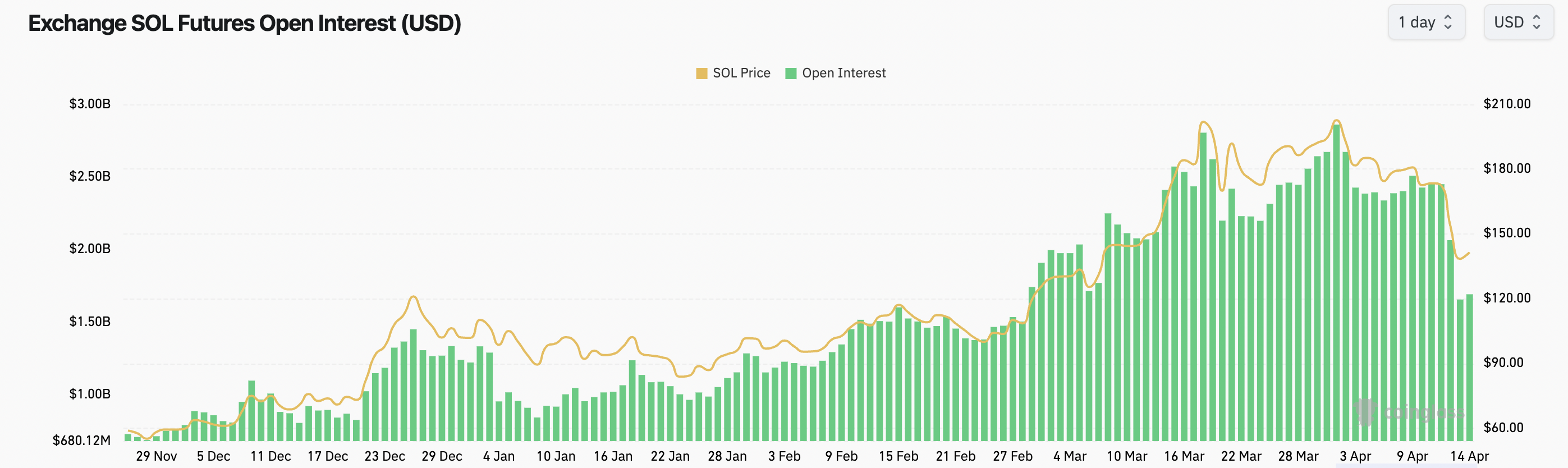 Theo dữ liệu của CoinGlass, vào ngày 14 tháng 4, OI của Solana (SOL) đứng ở mức 1,62 tỷ USD, giảm khoảng 21% so với ngày hôm trước. OI đo lường tổng giá trị của tất cả các hợp đồng tương lai Solana chưa thanh toán trên các sàn giao dịch.