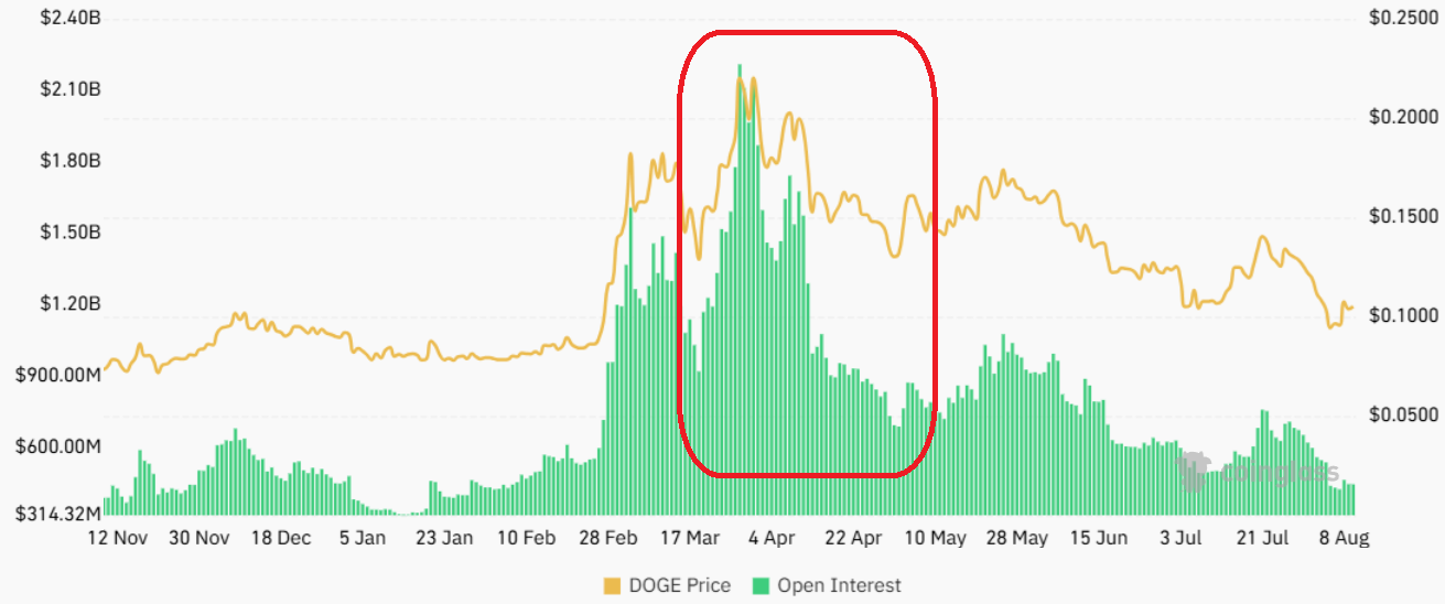 Từ ngày 20 tháng 3 đến ngày 28 tháng 3, DOGE đã trải qua đợt tăng giá 82%, đạt mức cao nhất là 0,23 USD khi lãi suất mở tương lai đạt đỉnh ở mức 2,3 tỷ USD. Các vị thế long có đòn bẩy quá mức đã dẫn đến việc thanh lý bắt buộc đáng kể khi DOGE điều chỉnh hơn 15% trong vòng năm ngày. Đợt điều chỉnh kéo dài trong ba tuần, với mức giá giảm 40% xuống còn 0,14 USD vào ngày 19 tháng 4.