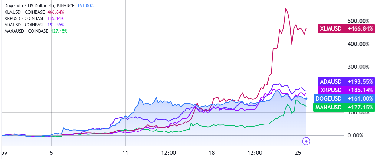 Đợt tăng giá 161% của DOGE tính đến ngày 25 tháng 11 thoạt nhìn có vẻ ấn tượng, nhưng xét về mặt so sánh, nó vẫn tụt hậu so với các đồng tiền khác như Stellar (XLM), Cardano (ADA) và XRP.